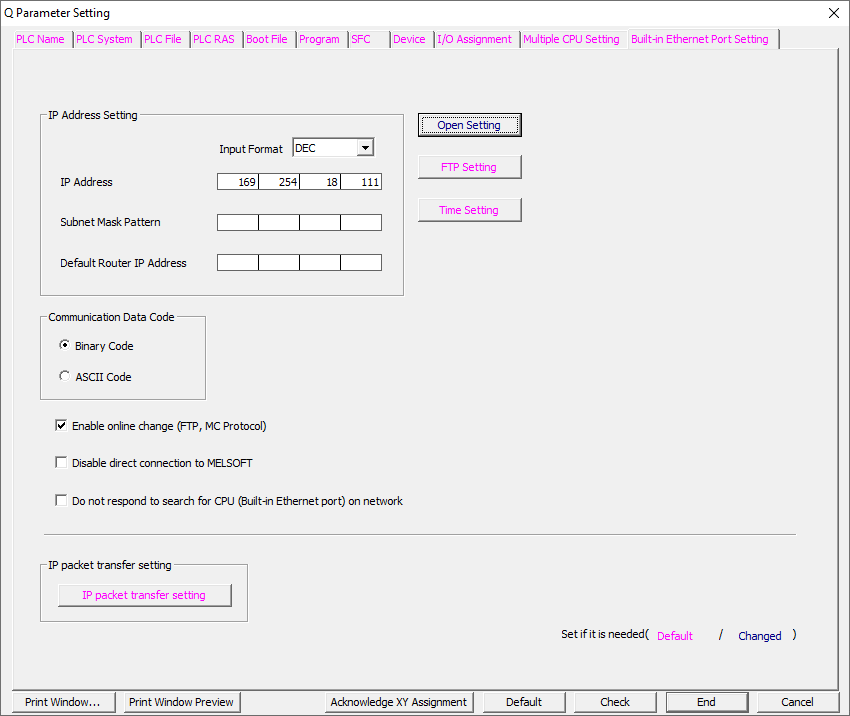 1. Öffnen Sie die SPS-Parametereinstellungen Ihres Projekts in GX Works2, und navigieren Sie zur Registerkarte für die Ethernet-Porteinstellungen. Die folgende Abbildung veranschaulicht eine Beispielkonfiguration einer MELSEC-SPS der Serie Q.