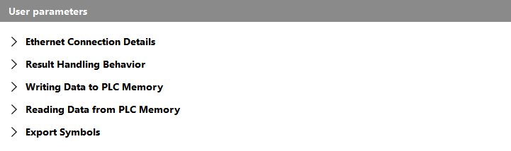 Die Parameter in dieser Kategorie definieren den Speicherort und den Namen der Datei, die beim Starten des Plugins exportiert wird. Die Datei hängt von der jeweiligen Konfiguration des Plugins ab und enthält die globalen Symbole aller Felder, die von der SPS reserviert werden sollen. Sie enthält einige Standardsymbole, die immer exportiert werden, z. B. das Symbol zum Anfordern von Befehlen, und auch die Symbole für die Anzahl der Ergebnisse und Iterationsparameter, die in der Konfiguration des Plugins definiert sind.