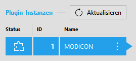 3. Vergewissern Sie sich, dass das Plugin noch nicht ausgeführt wird. Andernfalls sind die Parameter nicht für die Konfiguration verfügbar. Der aktuelle Zustand des Plugins ist am jeweiligen Statussymbol in der Liste der Plugin-Instanzen erkennbar. Wird das Symbol als Status angezeigt, ist das Plugin aktiv. In diesem Fall müssen Sie es durch Klicken auf die Schaltfläche „ Plugin stoppen“ unten im MERLIC RTE Setup stoppen. Wird stattdessen das Symbol als Status angezeigt, ist das Plugin derzeit nicht aktiv. In der folgenden Beispielabbildung ist die ausgewählte Instanz des MODICON®*-Plugins derzeit nicht aktiv, sodass die Konfiguration möglich ist.