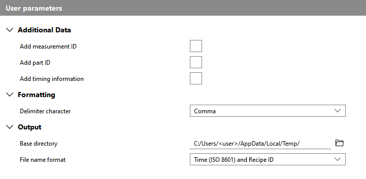 Dieser Parameter definiert das Verzeichnis, in dem die Datenergebnisse gespeichert werden. Sie können das Verzeichnis im Dateisystem über die Schaltfläche auswählen (auf lokalen Systemen) oder den Pfad direkt in das Textfeld eingeben. Das Verzeichnis ist standardmäßig „%LOCALAPPDATA%/Temp“ auf Windows-Systemen bzw. „/tmp“ auf Linux-Systemen.