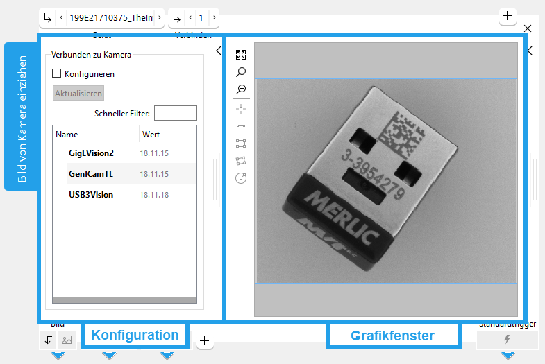Das Tool „Bild von Kamera einziehen“ wurde lediglich mit einer Kamera oder zwei Kameras gleichzeitig getestet. Die Verwendung von mehr als zwei Kameras liegt in Ihrer Verantwortung. Wir können nicht für einen einwandfreien Betrieb garantieren. Wenn Sie mehr als zwei Kameras verwenden möchten, sollten Sie das Tool Bildquelle über den MERLIC Image Source Manager (ISM) verwenden.