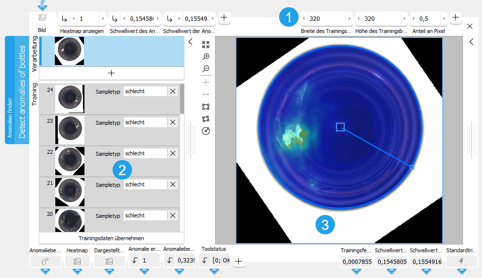 Die Trainingsparameter werden automatisch an die definierten Trainingsbilder angepasst. Die Suchparameter „Schwellwert des Anomaliebereichs“ und „Schwellwert der Anomaliebewertung“ auf der linken Seite werden beim Training ebenfalls automatisch festgelegt.