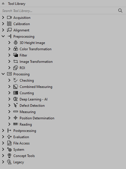 The Tool Library contains all available MERLIC tools A MERLIC tool is a modular unit with a specific functionality. It can be used to solve a specific task of an image processing application, to define conditions and expressions, or to communicate via various devices. Tools build the elementary part of a MERLIC Vision App. that can be used to create a MERLIC Vision App A MERLIC Vision App represents an image processing application created in MERLIC. It consists of the tools in the MERLIC Creator, the Designer widgets, and all settings that are used in the application..