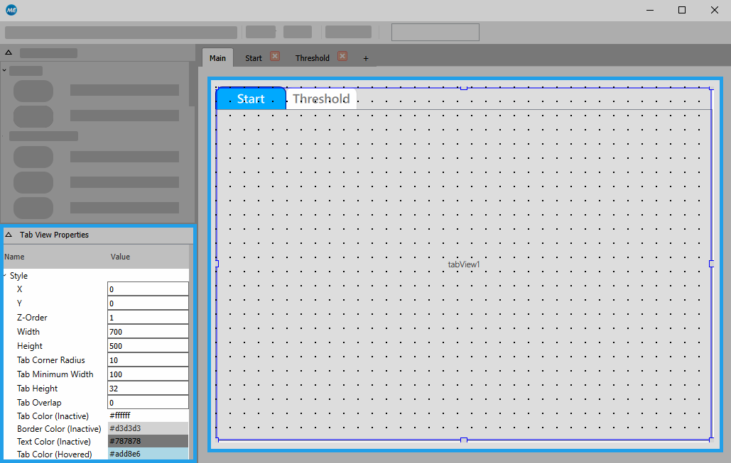 - Select the "Tab View" widget in the workspace to display its properties in the properties panel.
