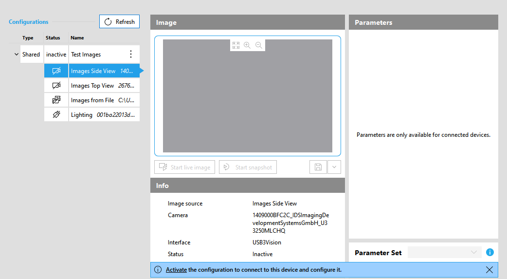 - The image source is automatically selected for configuration. Thus, general information as well as the settings for the configuration of the image source are automatically displayed on the right. However, the settings are only available for configuration if the configuration is active. In the example image below, you can see that the camera parameters are not available yet. To access the parameters, you first have to activate the configuration to which the new image source has been added. For more information on how to configure an image source and which configuration options are provided, see the topic Configuring Image Sources.