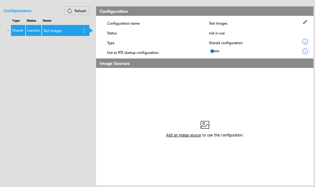 A configuration in the Image Source Manager represents a set of image sources. Each image source must be assigned to a specific configuration. It is not possible to add an image source without a configuration. Therefore, you first have to add a configuration for a new image source or you have to add the image source to an existing configuration.