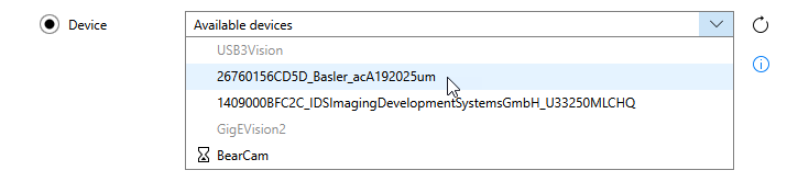 - Device: Use this option to add a camera device or a peripheral device such as a lighting or lens controller as image source.