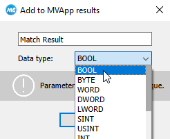 - Select the data type from the drop down list. In case of an image result, the data type is already preset and cannot be changed. For all other types of results, you can choose from various data types of the standard IEC 61131. For more information about the data types, see Supported Data Types.