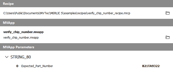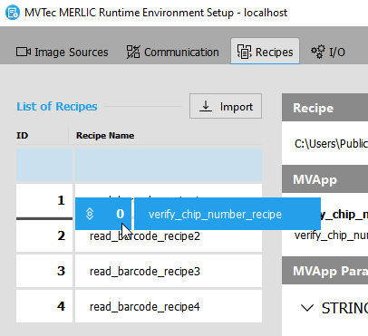 The "Recipes" tab of the MERLIC RTE Setup displays detailed information about the imported recipes A MERLIC recipe file is a crucial part for the MERLIC process integration. It is a separate file (with file ending .mrcp) that defines which MERLIC Vision App is loaded for the process integration. It also defines how the MVApp is parametrized because it contains a set of pre-defined input values for selected tool parameters. You can create multiple recipe files with individual sets of input values for one and the same MVApp. This enables you to reuse an MVApp with different parameter settings for various scenarios of your application. You can also use a recipe file to load an MVApp for a completely different image processing task. that are available for the process integration MERLIC can be used in machine vision systems that are integrated in a manufacturing machine. The machine controller, e.g., a programmable logic controller (PLC), must be able to control an integrated vision system, to monitor the execution, and to query the results. Therefore, MERLIC provides a process integration mode to enable the communication with a machine controller. The process integration mode can be started with the application "MERLIC RTE" that is provided with the MERLIC installation.. You can check which MERLIC Vision App (MVApp) is parametrized by a specific recipe and how the input values are defined. In addition, you can get important information such as the ID of a recipe from the "Recipes" tab.