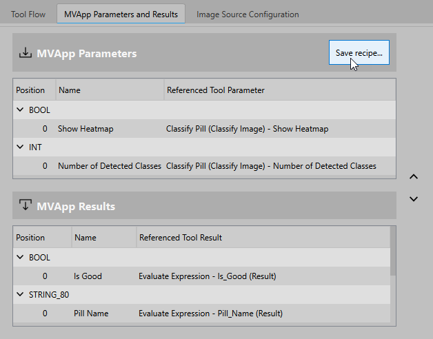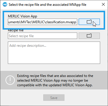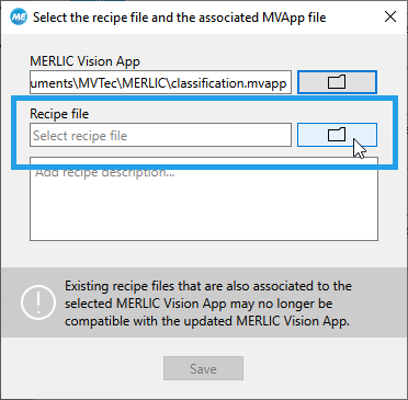 - Click the "Save" button to save the selected MVApp and to create the recipe file with file ending ".mrcp". The button becomes active as soon as an MVApp and a recipe file have been selected.