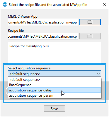 - If acquisition sequences are available in the currently active image source configuration, an additional drop-down menu is available for selecting an acquisition sequence. The selected acquisition sequence will be automatically activated when loading the recipe in MERLIC RTE mode. To use the acquisition sequence that is set as default in the "Image Sources" tab of the MERLIC RTE Setup, select the option "<default sequence>" from the drop-down menu.