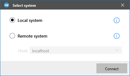 It can be connected to your local system or to a remote system. If you open the MERLIC RTE Setup via the MERLIC Creator, it is automatically connected to your local system. If you open it via the Windows start menu or the command line, you can usually select between local and remote system in the first step. However, no matter to which system the MERLIC RTE Setup is currently connected, you can always change to a different system at any time. All configuration changes in the MERLIC RTE Setup will be applied on the respective components of the currently connected system.