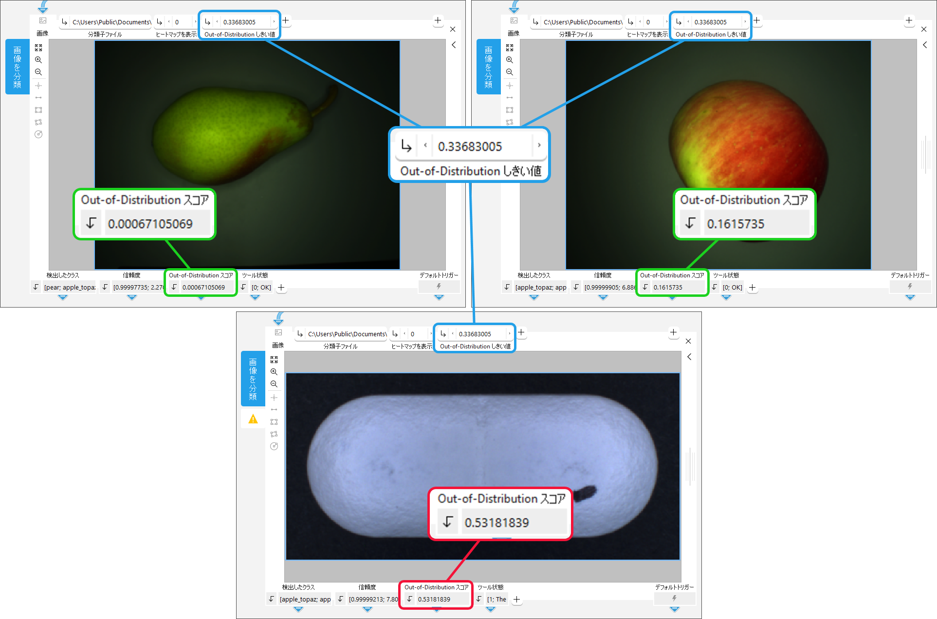 そのために、「画像を分類」ツールが拡張され、新しいツールパラメータ「Out-of-Distribution しきい値」と、新しいツール結果「Out-of-Distribution スコア」が加わっています。それぞれ、追加のパラメーターと追加の結果として提供されており、使用する分類子が OOD 向けに拡張されている場合にのみ利用可能です。「Out-of-Distribution スコア」はトレーニングされたクラスからの逸脱度を示します。「Out-of-Distribution しきい値」ではOut-of-Distribution のサンプルを識別するためのしきい値を調整できます。