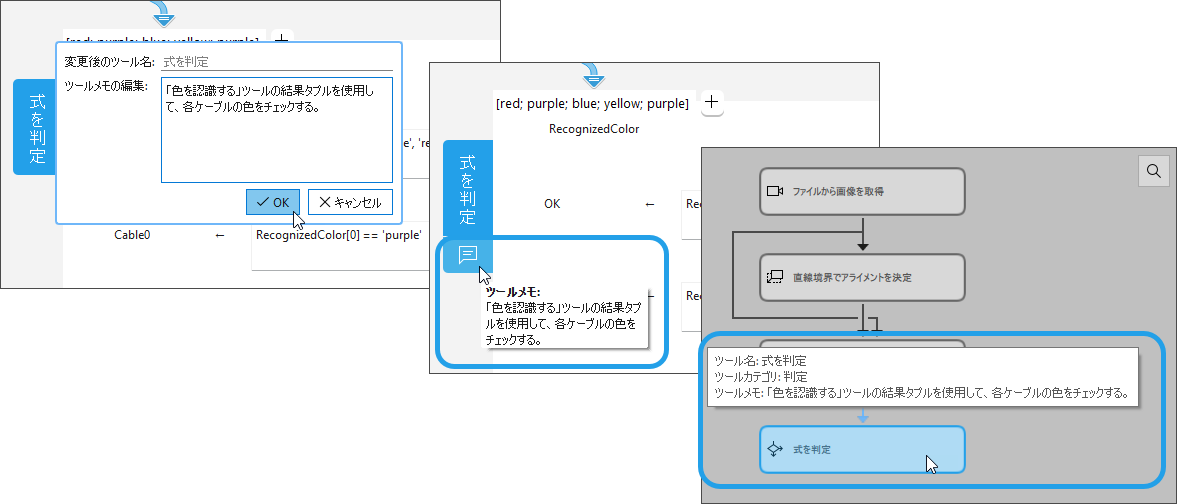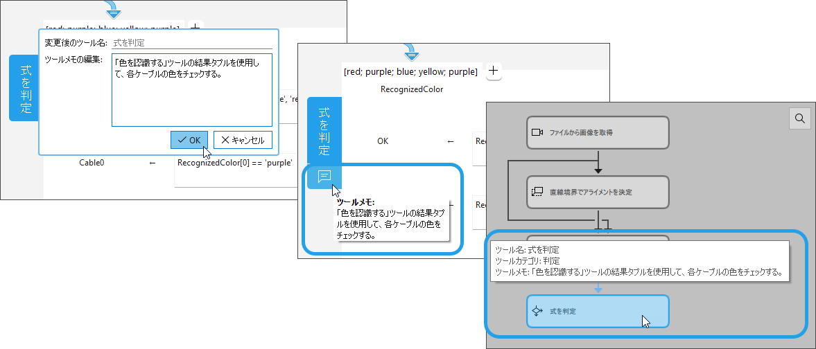 MERLIC Creator が改良され、MERLIC Vision App (MVApp) 内の MERLIC ツールおよびツールグループにメモを追加できるようになりました。ツールやツールグループに対し、それぞれのツールボードで説明を追加できます。MVApp を保存すると、それぞれのメモも保存されます。これにより、例えばツールの現在のパラメーター構成について説明するカスタムメモを追加できます。既存のツールメモは、ツールボードまたは ツールフロー パネルで直接確認できます。