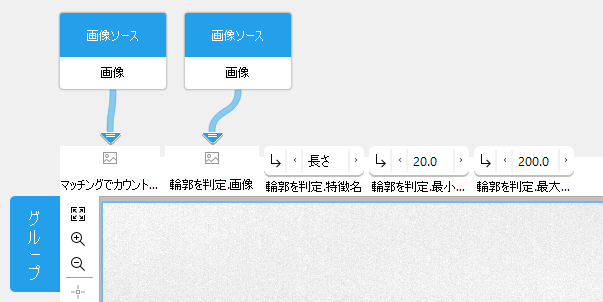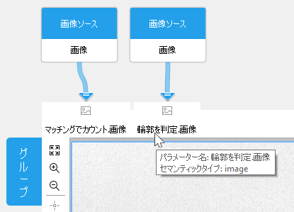 ツールワークスペース では、グループも通常のツールと同じように表示され、使用できる構成オプションも同じです。ただし、通常の MERLIC ツールとは違って、グループ内の異なるツールに属するパラメーターや結果を確認でき、グラフィックウィンドウには想定の画像が表示されない場合があります。デフォルトでは、最後に追加したツールの画像が表示されますが、グループで他の画像パラメーターや画像結果を使用できる場合は、それぞれのコネクター位置にある画像アイコンにカーソルを合わせるかアイコンをクリックすることで、それらの画像をグラフィックウィンドウに表示することができます。このように、グループで利用可能なパラメーターを構成するときに、どの画像を表示させるかを選択できます。