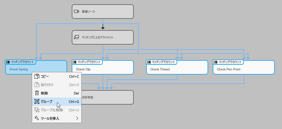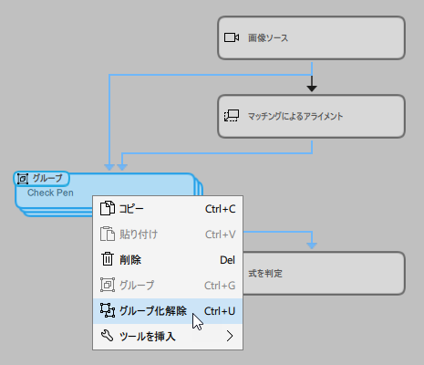 - ツールフロー パネルでグループを右クリックしてコンテキストメニューを開き、「