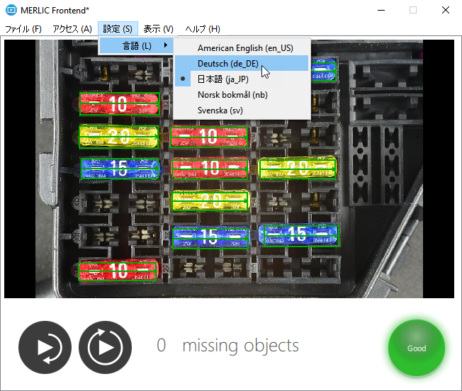 言語変更の前提条件として、MERLIC Frontend の言語設定が MERLIC Vision App の Frontend の設計時に、設計に応じて調整する必要があります。これらの言語設定では、MERLIC Frontend が開かれるデフォルト言語も変更できます。リモート接続で開かれた場合も含めてデフォルト言語はすべての MERLIC Frontend に適用されます。すなわち、デフォルト言語はアプリケーションに依存しません。したがって、デフォルト言語の設定は、MERLIC 設定に保存され、MERLIC Vision App には保存されません。