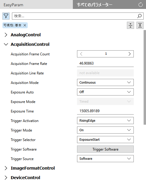 この EasyParam はカメラパラメーター「Exposure Mode」に依存します。グレイ表示されている場合は、EasyParam の「Automatic Exposure Control」を「Off」に設定し、「すべてのパラメーター」のカメラパラメーター「Exposure Mode」を「Timed」に設定してみてください。