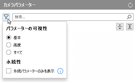 カメラパラメーターのリストをフィルタして、関連するパラメーターのみを表示できます。フィルタオプションは「すべてのパラメーター」タブ上部にある ボタンで開きます。フィルタカテゴリには、 「パラメーターの可視性」と「永続性」があります。