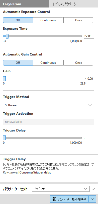 この EasyParam はカメラパラメーター「Exposure Mode」に依存します。グレイ表示されている場合は、「すべてのパラメーター」タブのカメラパラメーター「Exposure Mode」を「Timed」に設定してみてください。