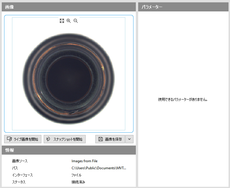 選択した画像ファイルディレクトリの詳細が読み込まれ、画像ソースリストの右側に表示されます。これで、画像プレビュー領域を使用して、選択した画像ファイルディレクトリの画像ファイルを確認したり、特定の画像ファイルまたはすべての画像ファイルを別の場所に保存したり、あるいは「情報」領域で画像ソースの詳細情報を調べたりできます。構成するカメラパラメーターがないため、右側の「パラメーター」セクションは空のままです。