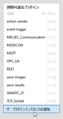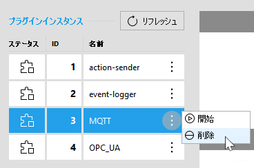 各プラグインインスタンスは、実行ステータス、ID および名前とともに表示されます。プラグインのインスタンスを複数追加した場合、プラグインのすべてのインスタンスが同じ名前で表示されます。ただし、プラグインインスタンスの ID は一意です。