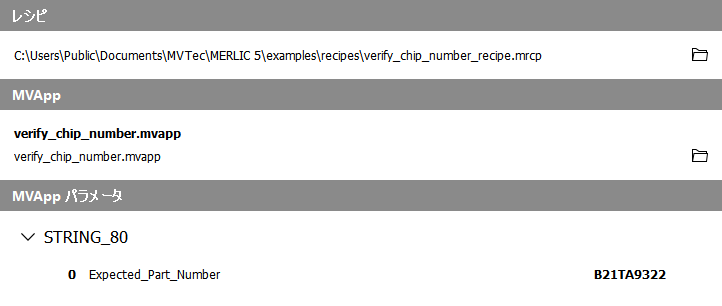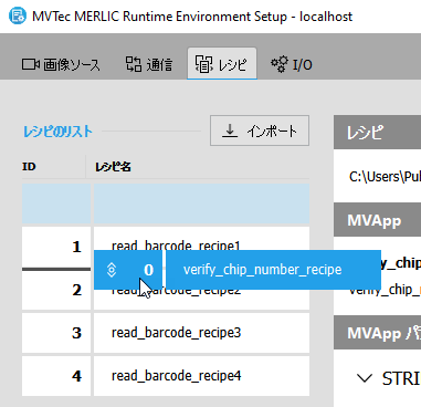MERLIC RTE Setup の「レシピ」タブには、プロセス統合 MERLIC は、製造マシンに統合されたマシンビジョンシステムで使用できます。プログラマブルロジックコントローラ (PLC) などのマシンコントローラでは、統合ビジョンシステムの制御、実行の監視、結果の照会が可能でなければなりません。そのため、MERLIC には、マシンコントローラとの通信に必要なプロセス統合モードが備わっています。 プロセス統合モードは、 MERLIC インストレーションに用意されているアプリケーション「MERLIC RTE」で開始できます。用に使用可能なインポートされたレシピ MERLIC レシピファイルは、MERLIC プロセス統合に不可欠の要素です。独立したファイルであり (ファイル拡張子は .mrcp)、プロセス統合用にどの MERLIC Vision App を読み込むか定義します。また、選択されたツールパラメーター用に事前に定義された入力値のセットを含んでおり、MVApp によるパラメーター化の方法も定義します。 同一の MVApp について、異なる入力値のセットを含む複数のレシピファイルを作成することができます。これにより、アプリケーションの様々なシナリオについて、異なるパラメーター設定の MVApp を再使用できます。レシピファイルを使用して、まったく別の画像処理タスク用に MVApp を読み込むこともできます。に関する詳細情報が表示されます。特定のレシピによってどの MERLIC Vision App (MVApp) がパラメーター化されているか、および入力値がどのように定義されているかを確認できます。また、「レシピ」タブで、レシピ ID などの重要な情報を得ることができます。