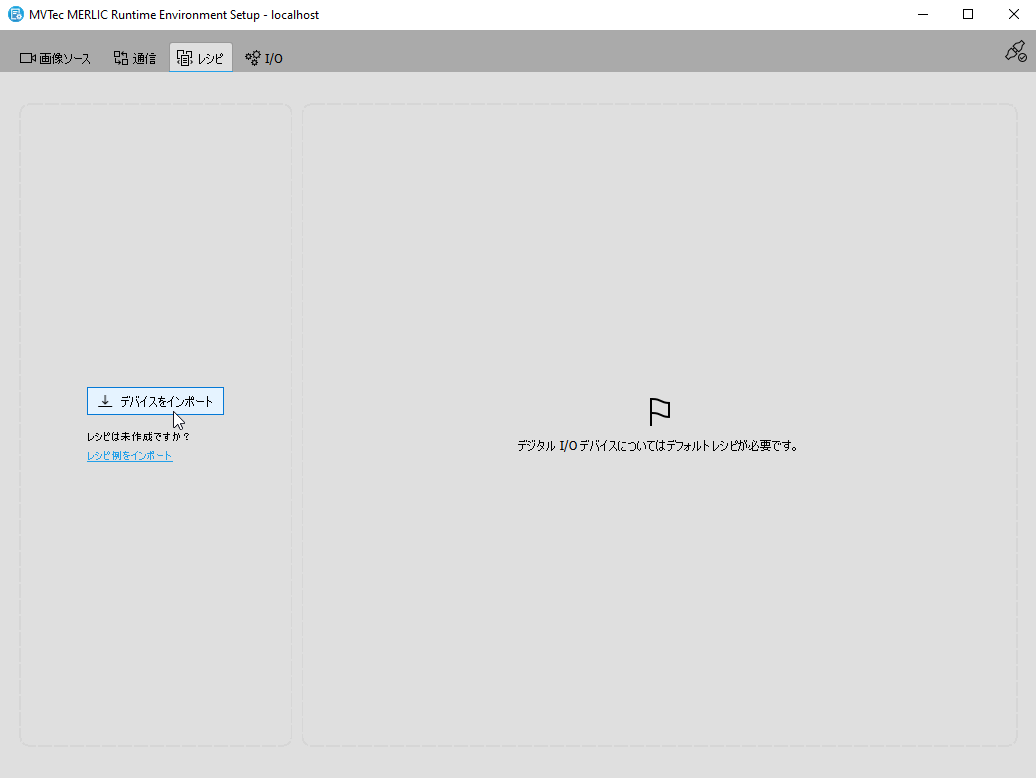 デバイスをインポート」をクリックしてファイル選択ダイアログを開きます。付属のサンプルレシピをインポートして確認する場合は、「サンプルレシピをインポート」をクリックすることもできます。