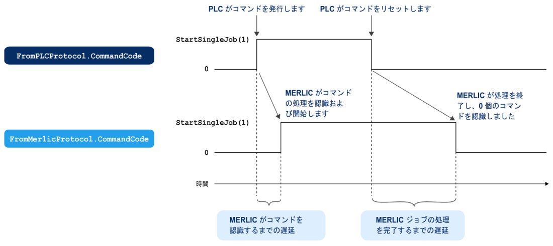 下の図は、コマンド「StartSingleJob」のハンドシェイクプロセスを示します。プロトコル FromPLCProtocol で CommandCode を 1 に設定することで、PLC が 1 回の実行をトリガーします。MERLIC がコマンドを認識すると、PLC のための確認としてプロトコル FromMerlicProtocol のメンバー CommandCode も 1 に設定され、MERLIC が 1 回の反復で MVApp を実行します。PLC が MERLIC からコマンド認識の確認を受信すると、FromPLCProtocol のメンバー CommandCode が 0 に設定され、ハンドシェイクプロセスが完了します。MVApp の 1 回の反復の完了後、MERLIC が PLC から送信された CommandCode を確認し、それに基づいて処理を続けます。