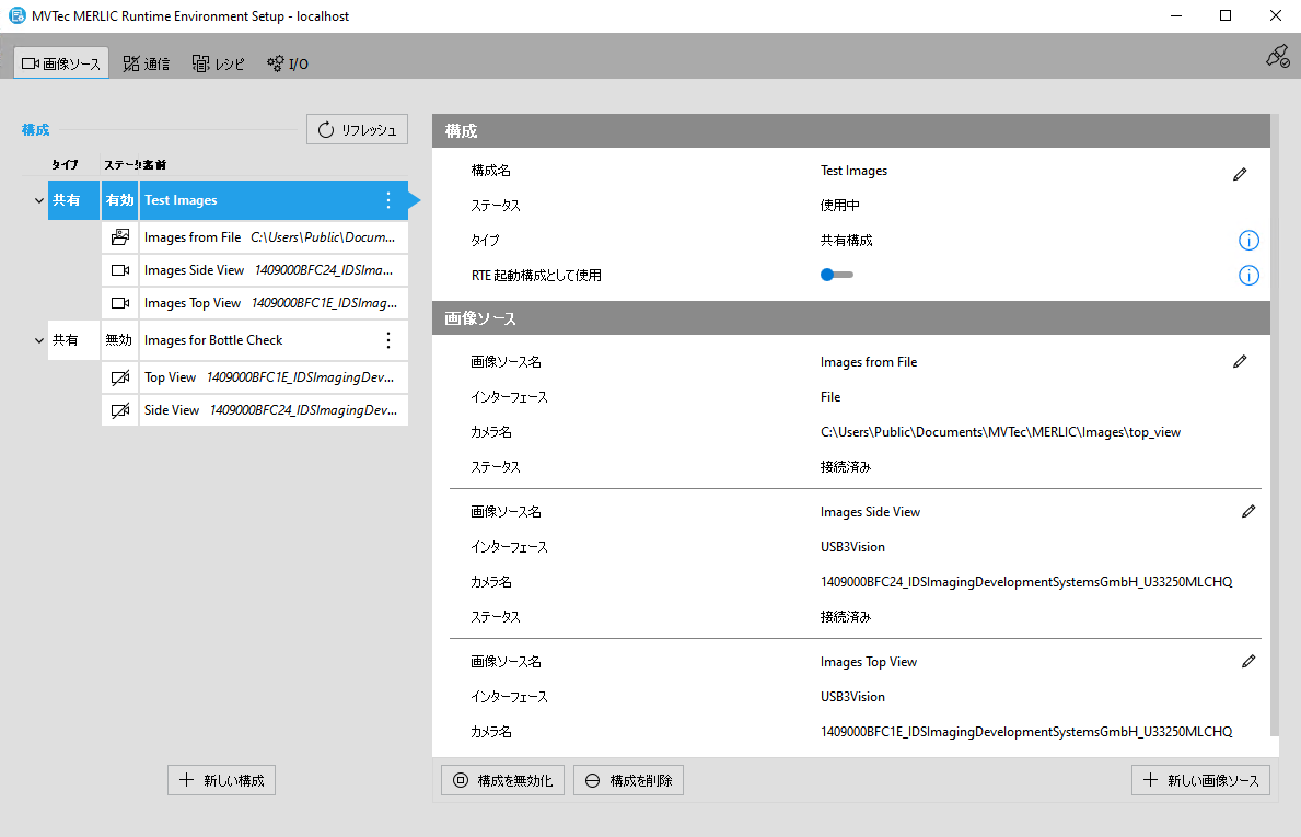 MERLIC RTE Setup の「 画像ソース」ブは、Image Source Manager による画像取得用の画像ソースの構成に使用するグラフィカルユーザーインターフェースです。これにより MERLIC Vision App に関係なく画像ソースを構成できます。カメラデバイス、画像ディレクトリ、または周辺デバイス (照明コントローラなど) といったさまざまなタイプの画像ソースを設定できます。画像取得に Image Source Manager を使用するときには、各画像ソースを特定の画像ソース構成 画像ソース構成は、Image Source Manager の画像ソースのセットを表します。それぞれの画像ソースは、特定の構成に割り当てる必要があります。構成なしで画像ソースを追加することはできません。したがって、最初に新しい画像の構成を MERLIC RTE Setup の「画像ソース」タブに追加します。あるいは、画像ソースを既存の構成に追加します。