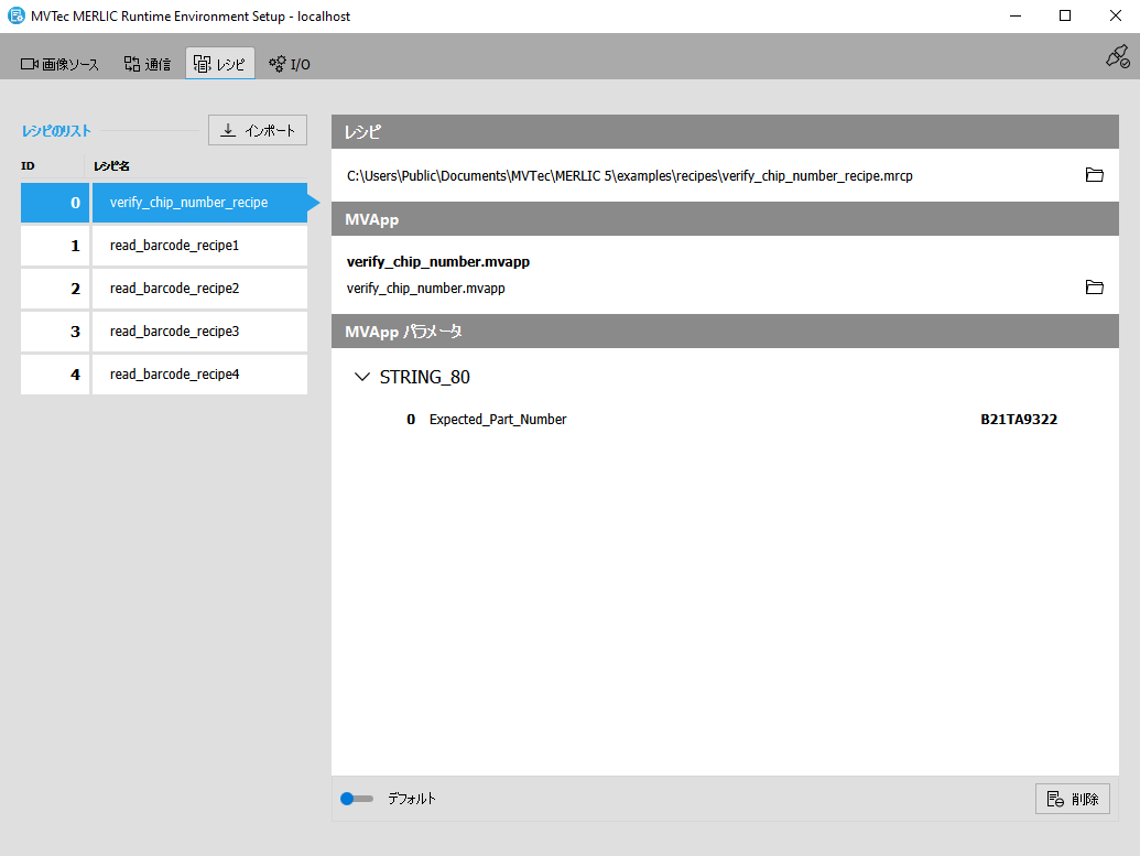 同一の MVApp について、異なる入力値のセットを含む複数のレシピファイルを作成することができます。これにより、アプリケーションの様々なシナリオについて、異なるパラメーター設定の MVApp を再使用できます。レシピファイルを使用して、まったく別の画像処理タスク用に MVApp を読み込むこともできます。を設定できます。レシピファイルをインポートし、インポートされたレシピの内容を確認し、MERLIC RTE の起動後に自動的に読み込まれるデフォルトのレシピを定義できます。