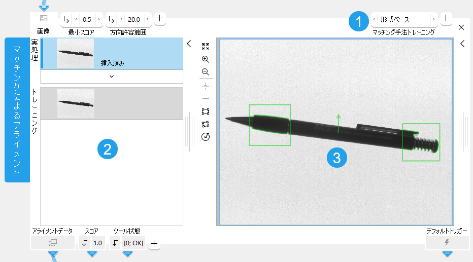 このツールのために、ツールボード の左にトレーニングエリアがあります。トレーニングエリアでは、個々の画像をクリックすれば、検索用の処理モードとアライメントデータのトレーニング用のトレーニングモード間で変更ができます。 グラフィックスウィンドウには、現在有効なモードの画像が表示され、トレーニングエリアで青色にハイライトされます。左上の検索パラメータに加えて、このツールには、右上にトレーニング用のパラメータが表示されます。