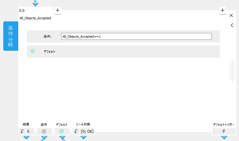 アイコン は、有効な分岐トリガーを示します。分岐トリガーは常に 1 つ有効になっています: 条件が真の場合、コネクター「条件」が有効になり、トリガーを送信します。それ以外の条件下(条件が真ではなく、条件が定義されていない場合やツールが不正状態にある場合)では、分岐トリガー「デフォルト」が有効になってトリガーを送信します。有効なコネクターに接続されているすべてのツールが実行されます。