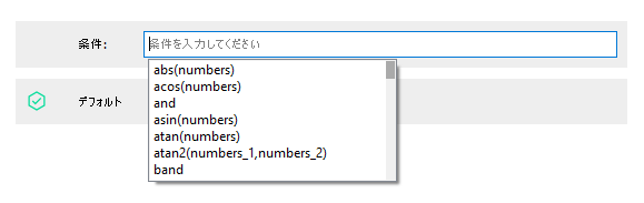 リスト全体から直接参照するには、ショートカット CTRL + スペースキーを使用してポップアップを手動で開きます。指定可能な関数と演算子の詳細については、「式を判定」のトピックを参照してください。