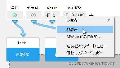 ツールワークスペース の下部で結果を非表示にすることができます。たとえば、他のツールに未接続で、ツールフロー のさらに下でのみ使用される中間結果がある場合です。非表示にしたい結果を右クリックし、「非表示」を選択します。非表示の結果を表示するには、結果の右側にある ボタンを使用します。