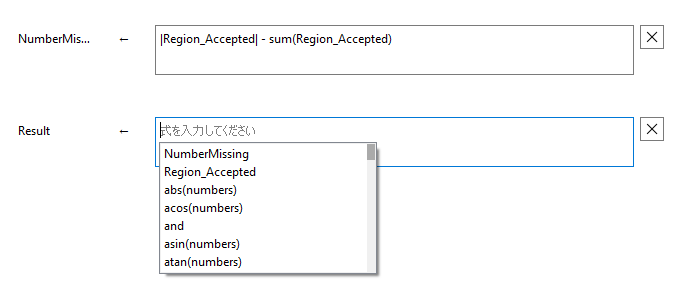 この画像では、CTRL +スペースキーを使用して手動で開いた後の、可能なすべての関数と演算子を含むポップアップリストを確認できます。リストの一番上に、最初の式「NumberMissing」の結果と、パラメーター「Region_Accepted」が表示されます。