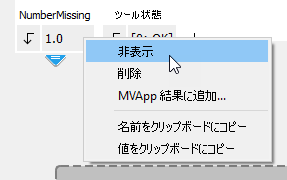 結果を非表示にすることができます。たとえば、他のツールに未接続で、ツールフロー のさらに下の式でのみ使用される中間結果がある場合です。非表示にしたい結果を右クリックし、「非表示」を選択します。非表示の結果を表示するには、結果の右側にある ボタンを使用します。