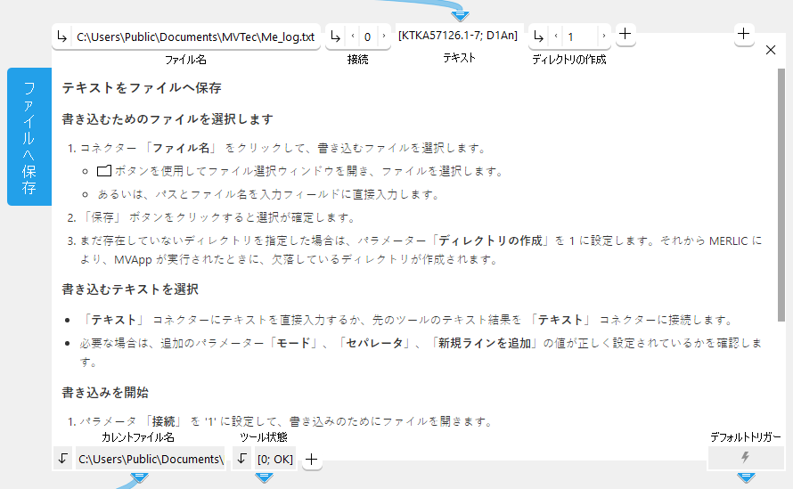 パラメーター「ファイル名」でのパスおよびファイル名を入力します。コネクター「接続」が 1 に設定され、MVApp が実行されている場合、ファイルは MVApp によって作成されて開かれます。ファイルが MVApp によって開かれている限り、別のプロセスでこのファイルを使用することはできません。「接続」が 1 に設定されている場合、MVApp の各実行に書き込み操作が適用されます。MERLIC を 1 回実行するボタン は、このツールをシングルステップで実行するときに使用します。その場合、テキストを段階ごとに書き込むことができます。ファイルを閉じるには、コネクター「接続」を 0 に設定します。