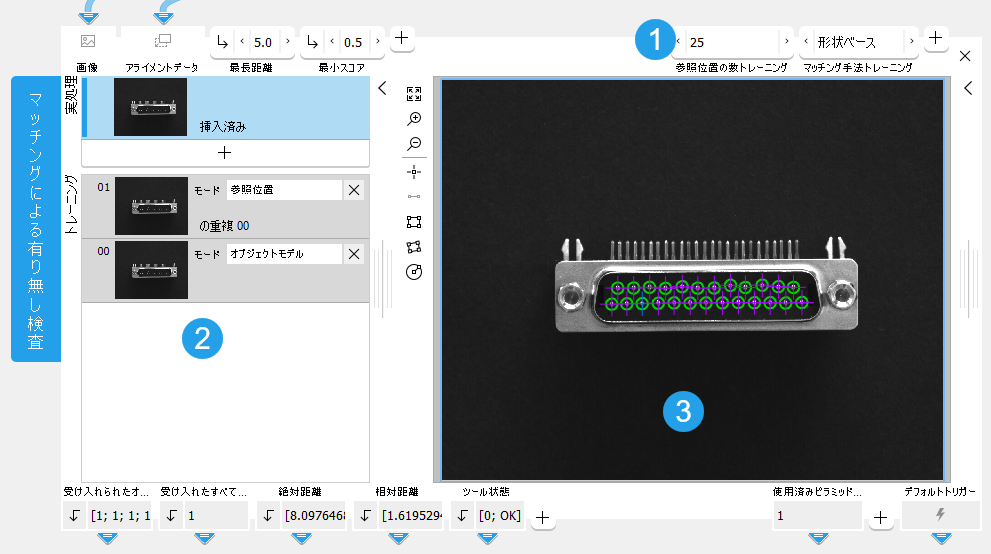 このトレーニングパラメーターは、チェックに使用したマッチング手法を定義します。パラメーターの設定値はデフォルトで「形状ベース」です。 対応するコネクターで「マッチング手法トレーニング」を変更できます。