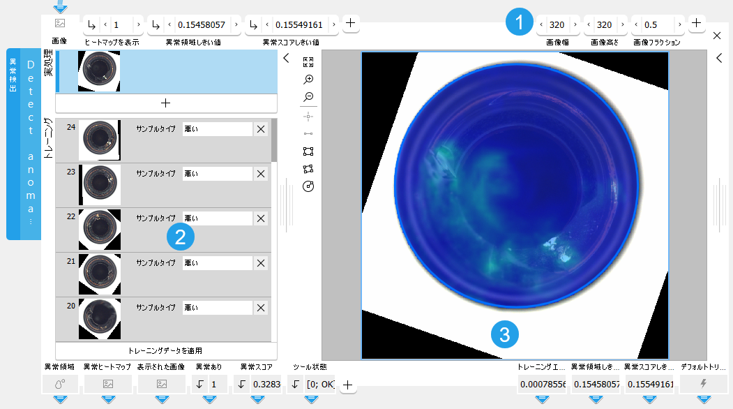 このツールは、トレーニングモードとともに使用されます。 すなわち、最初のトレーニングは、異常のあるトレーニング画像と異常のないトレーニング画像の選択したサンプルと、特定のトレーニングパラメーターに基づいて行います。「不良」サンプル (異常を示す画像) 付きの画像のトレーニングは必要ありませんが、ディープラーニングモデルの強化に役立ちます。