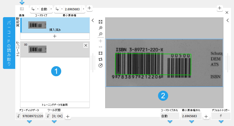 - 「トレーニングデータを適用」ボタンをクリックしてトレーニングを実施します。トレーニング画像セットのパラメータは、自動的に決まります。さらに、このツールでは、処理モードに自動的に切り替わり、現在の画像に、検出したコードが表示されます。