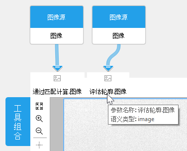 在工具工作区中,群组将与常规工具一样显示,可用的配置选项也相同。但是,与常规 MERLIC 工具不同,您可能会看到属于群组中不同工具的参数和结果,并且图形窗口可能不会显示您期望的图像。默认情况下会显示最后添加的工具的图像,但如果群组中有其他可用的图像参数或图像结果,则可通过在相应连接器的图像图标上悬停或单击,从而在图形窗口中显示这些图像。这样,您可以选择在配置群组中的可用参数时要显示的图像。