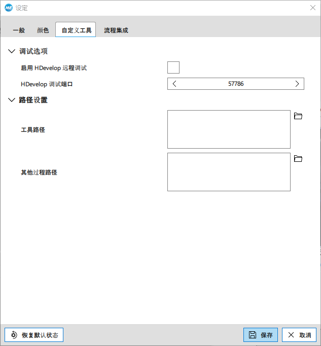 此选项定义了 MERLIC 查找代表 MERLIC 自定义工具的 HDevelop 过程库的位置。要在 MERLIC 中使用自定义工具,您必须将相应 HDevelop 过程库的位置添加到工具路径列表中。 单击 要编辑已定义的工具路径之一,请单击该路径并选择所需位置,或者通过单击路径旁边的 |