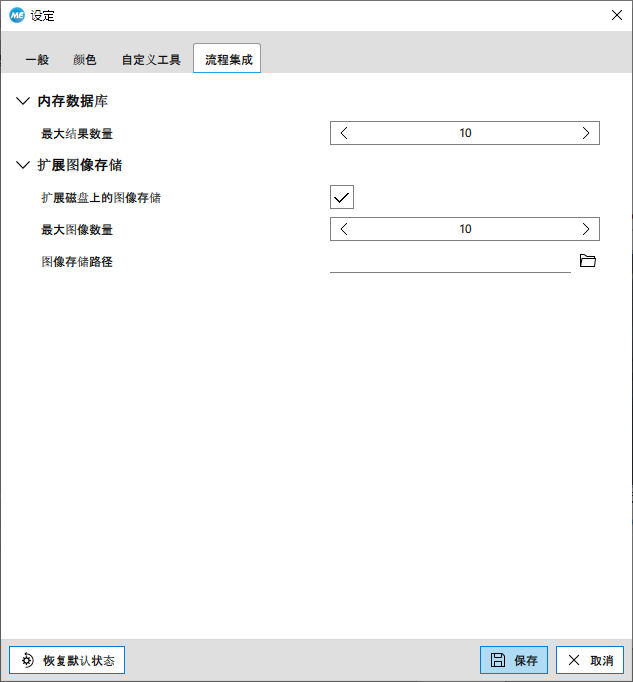 在此选项卡中,您可以调整 MERLIC 内存结果数据库和扩展图像存储的设置,以配置 MERLIC RTE 的可用结果数量和 MERLIC 的流程集成模式。