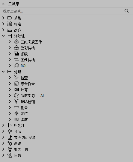 工具按类别进行划分,这些类别大致代表了典型机器视觉应用程序的步骤。请参阅 MERLIC 工具参考,了解关于提供的 MERLIC 工具的更多信息。