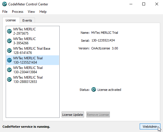- 通过 Windows 开始菜单打开“CodeMeter Control Center”,选择试用许可,然后单击“WebAdmin”在浏览器中打开 CodeMeter 的 Web 管理页面。