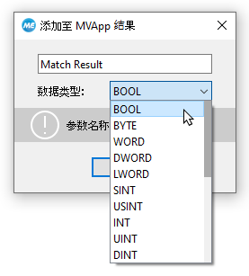 - 从下拉列表中选择数据类型。对于图像结果,数据类型已预设,且无法更改。对于所有其他类型的结果,您可以从标准 IEC 61131 中的各种数据类型当中进行选择。有关数据类型的更多信息,请参阅受支持的数据类型。