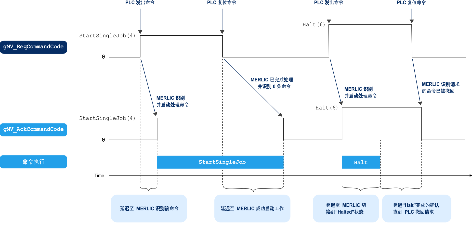如果命令已完成执行,且 PLC 已将“gMV_ReqCommandCode”字段重置为 0,则“gMV_AckCommandCode”字段也会被重置为 0。PLC 现在可以假设命令已经完成,并且视觉系统已经准备好接收下一个命令。下图以“StartSingleJob”和“Halt”命令为例显示了握手过程。