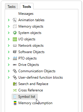 2. 选择左侧的“Tools”选项卡并单击“Symbol list”。
