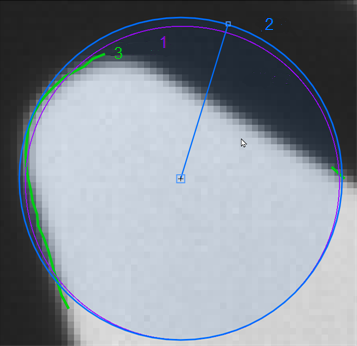 此参数定义了必须由沿 ROI (3) 检测的轮廓 (2) 支持的圆形 (1) 的最小分数。如果检测的轮廓占圆周的比例小于 “最小边缘完整性”,MERLIC 将不会创建圆形。在这种情况下,轮廓和圆形都不会显示。将沿 ROI 的整个边缘检测用于确定 “最小边缘完整性” 的轮廓,并且如左边图像所示,轮廓可能还会包括不需要的轮廓段。 “最小边缘完整性”被定义为介于 0 和 1 之间的值,并可以被解读为一个介于0至100%的百分比值。默认情况下设置为 0.5。但是,如果选择边缘,此值将由 easyTouch 自动确定。不过,如果您仅要使用具有特定“最小边缘完整性”圆,您也可以手动调整参数值。 |